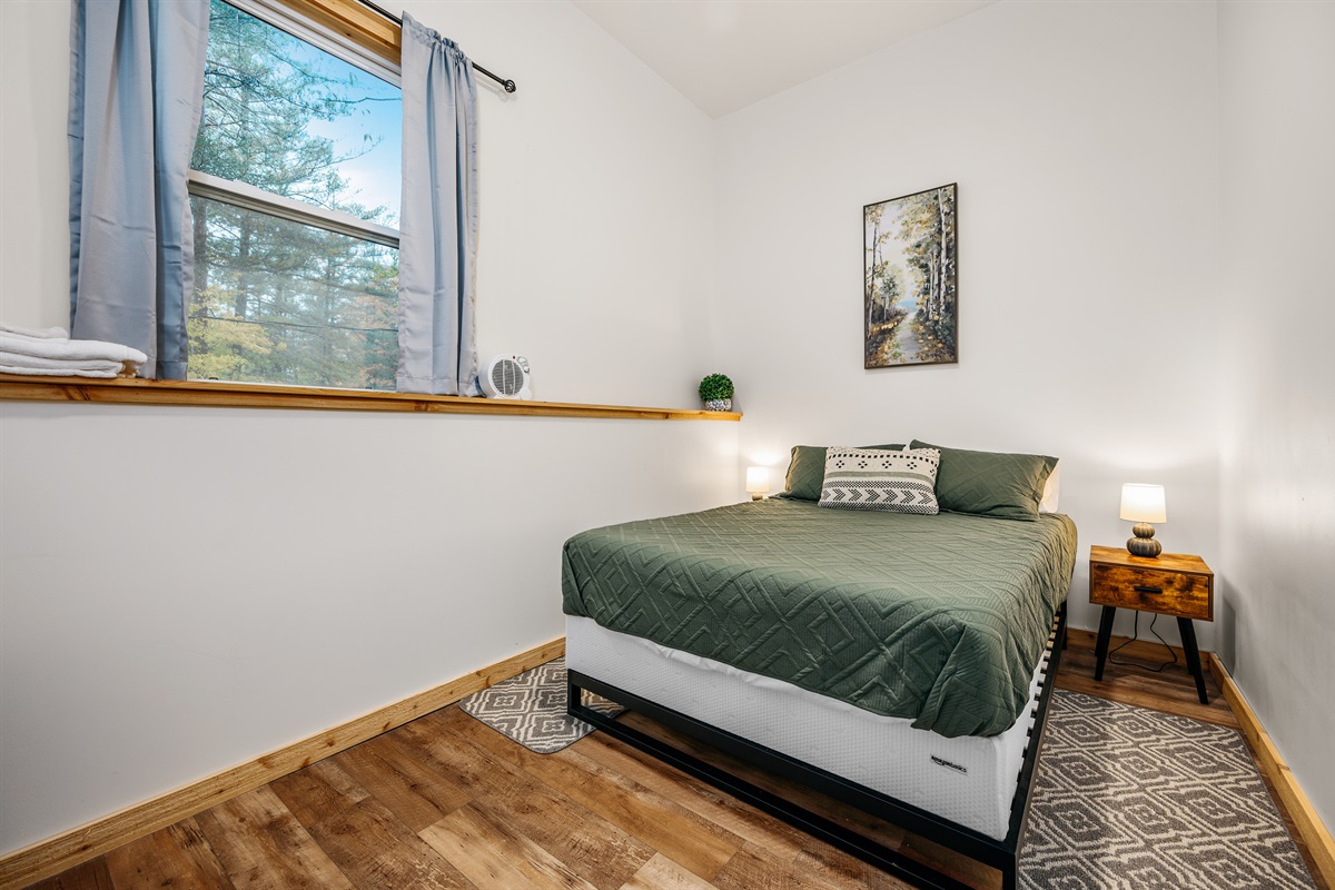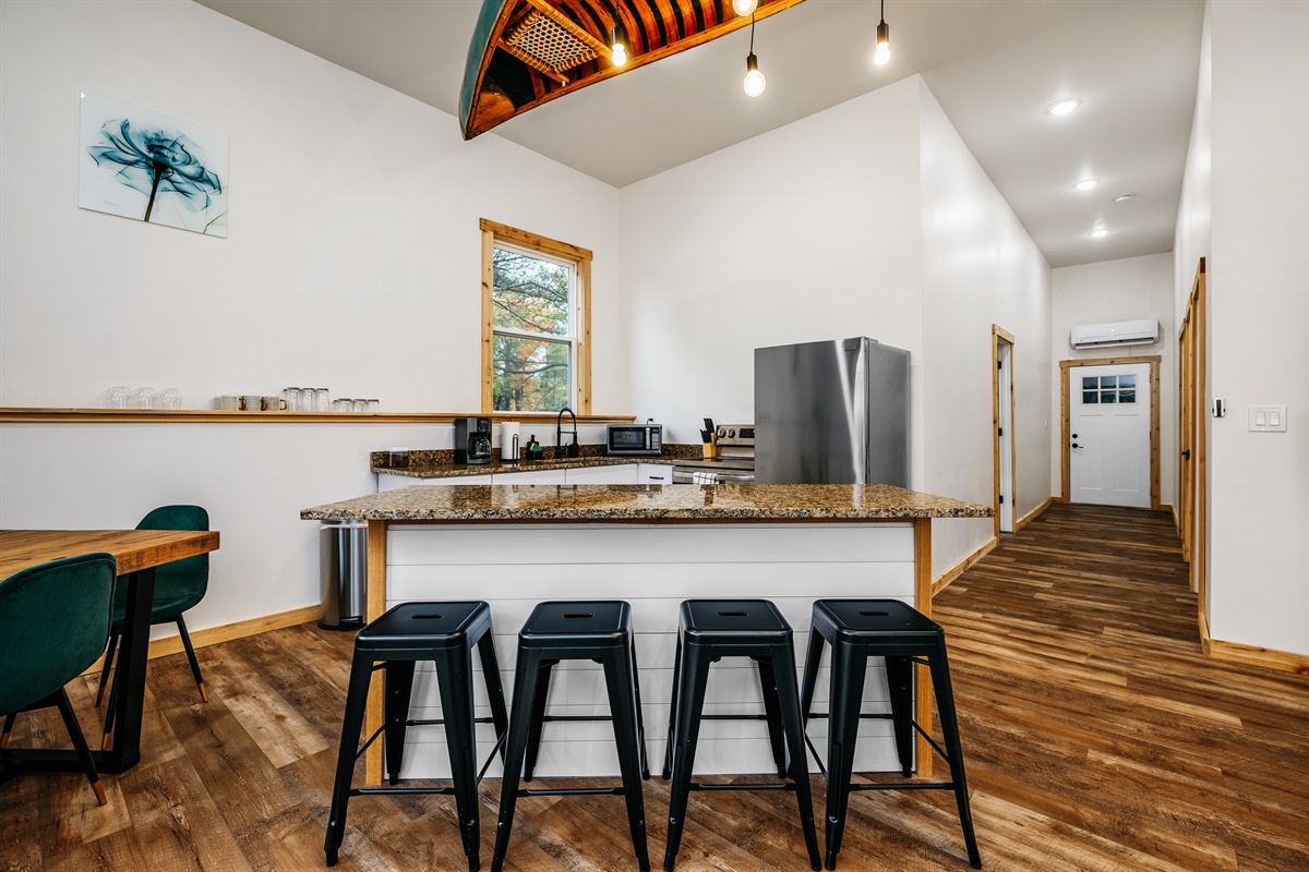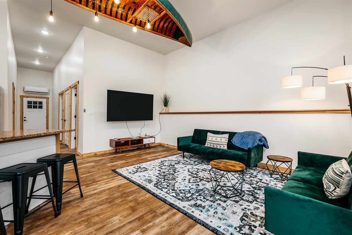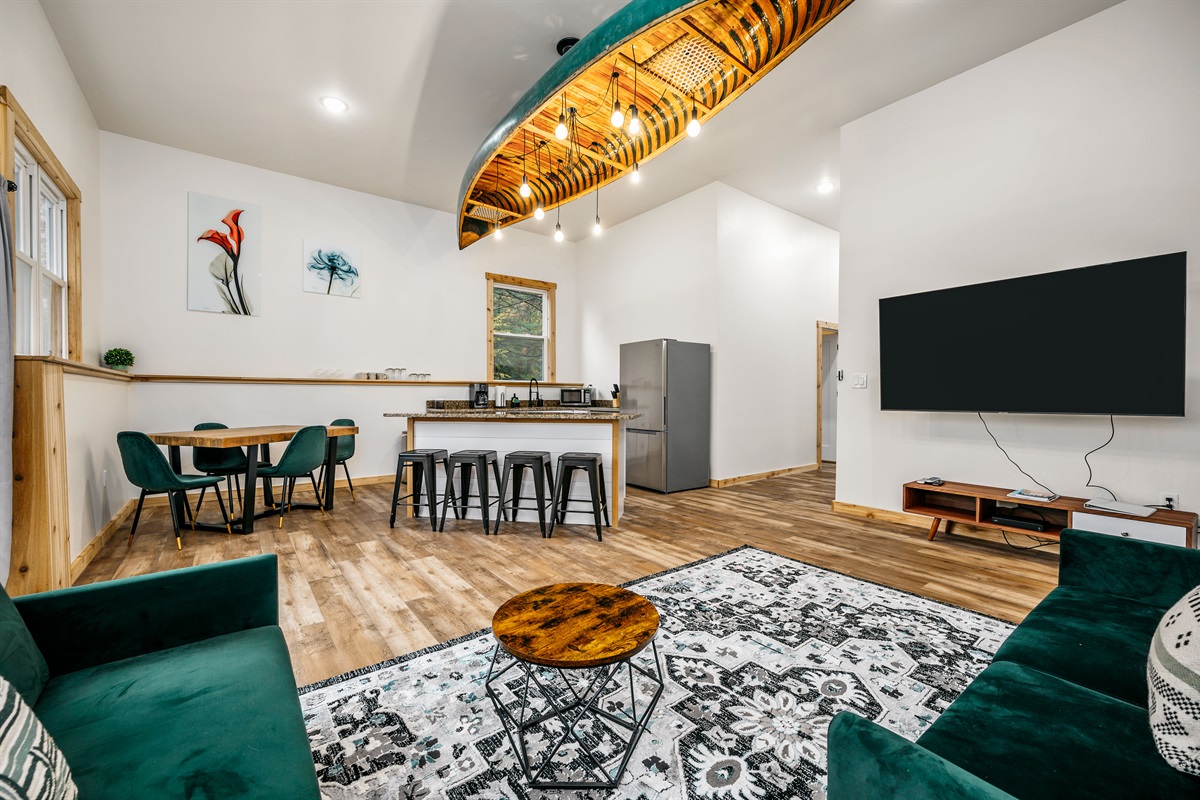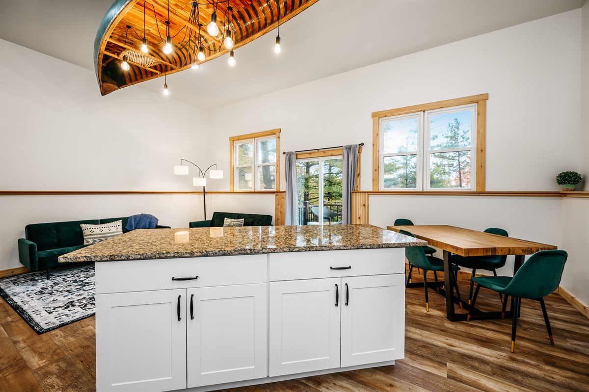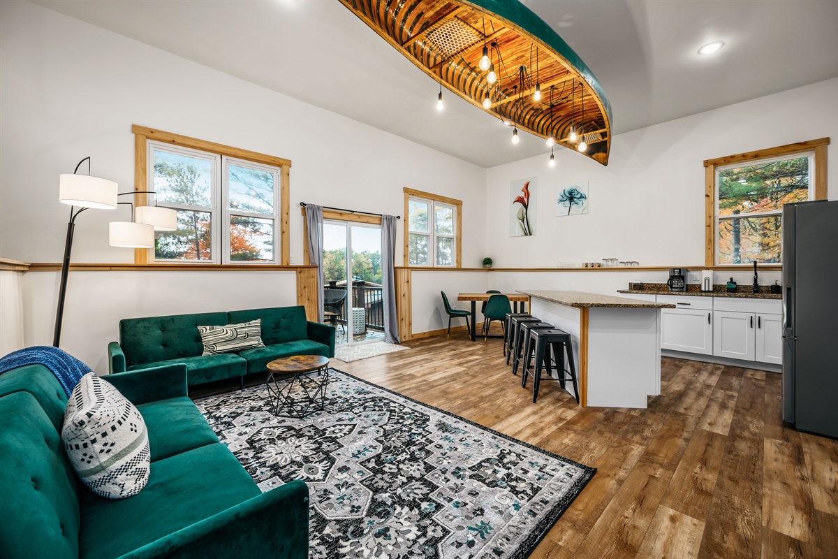 This modern rustic escape has a style all its own. An antique canoe hangs from the 12ft ceiling providing the lighting for memorable nights with friends and family. Days are spent on beautiful Spider Lake. Make sure to inquire about our brand new pontoons! This space has 2 bedrooms w/queen beds and additionally 2 futons in the living room. Each of the 2 baths have massive tiled showers. This is part of a lakeside resort where other guests will share the beach and exterior amenities.